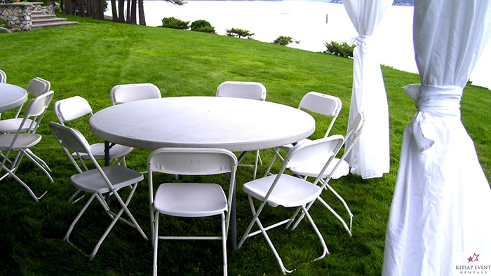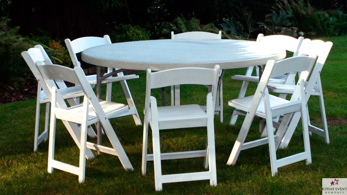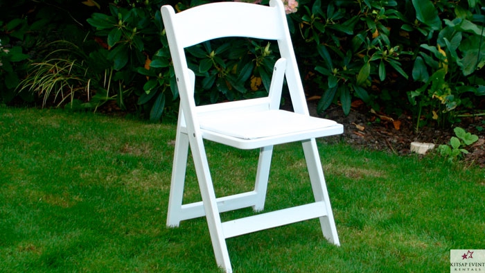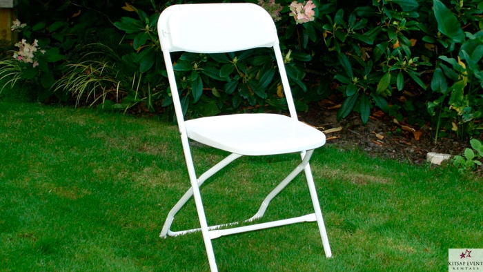 White Folding Plastic/Metal Framed Chair - Measures 31" from the ground to top back and is 18" across the seat.