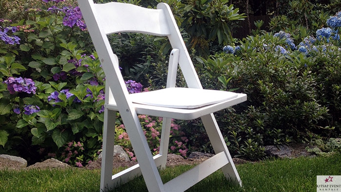 This is a White Wood Chair with a padded seat. This chair is featured in our Kitsap Enhanced Wedding packages. They measure 31" from the back to the ground and are 18" wide.
